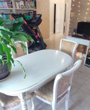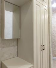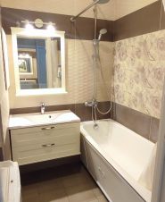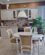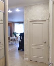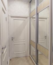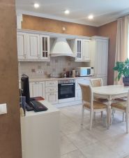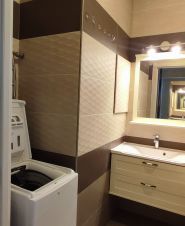 Современная встроенная кухня укомплектована холодильником, индукционной плитой, духовым шкафом, посудомоечной машиной фирмы BOSCH. Удачно расположены большой встроенный шкаф-купе и прихожая. Из спальни можно попасть на застеклённую лоджию 2,9м². Санузел раздельный, в ванной подключена стиральная машина. Высота потолков 2,8 м. В квартире тёплые электрические полы на кухне, в прихожей и в санузле с ванной. Также есть кондиционер. На выбор несколько провайдеров для подключения интернета.