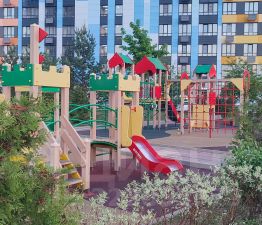 Двор дома с детскими игровыми площадками огорожен, вход по электронному ключу. Лаконичный ландшафтный дизайн придомовых территорий способствует приятным прогулкам.