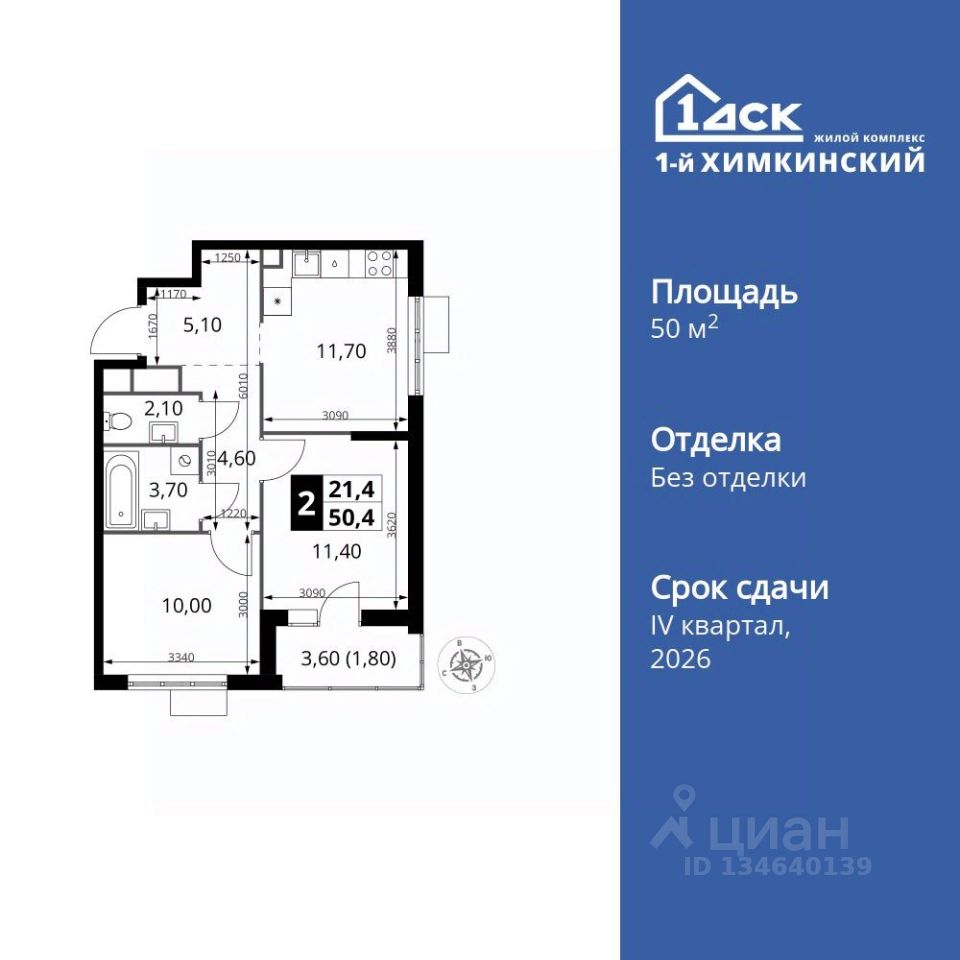 Продаётся 2-к квартира номер 201 общей площадью 50.4 кв.м. на 5-м этаже 16 этажного дома. Без отделки.