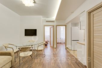 В гостиной - большой раскладывающийся угловой диван со спальным местом 140x200, LED телевизор с выходом в интернет, стеклянный стол, 5 стульев, "умная" приточно-отточная бесшумная система вентиляции и кондиционирования Mitsubishi Lossnay.