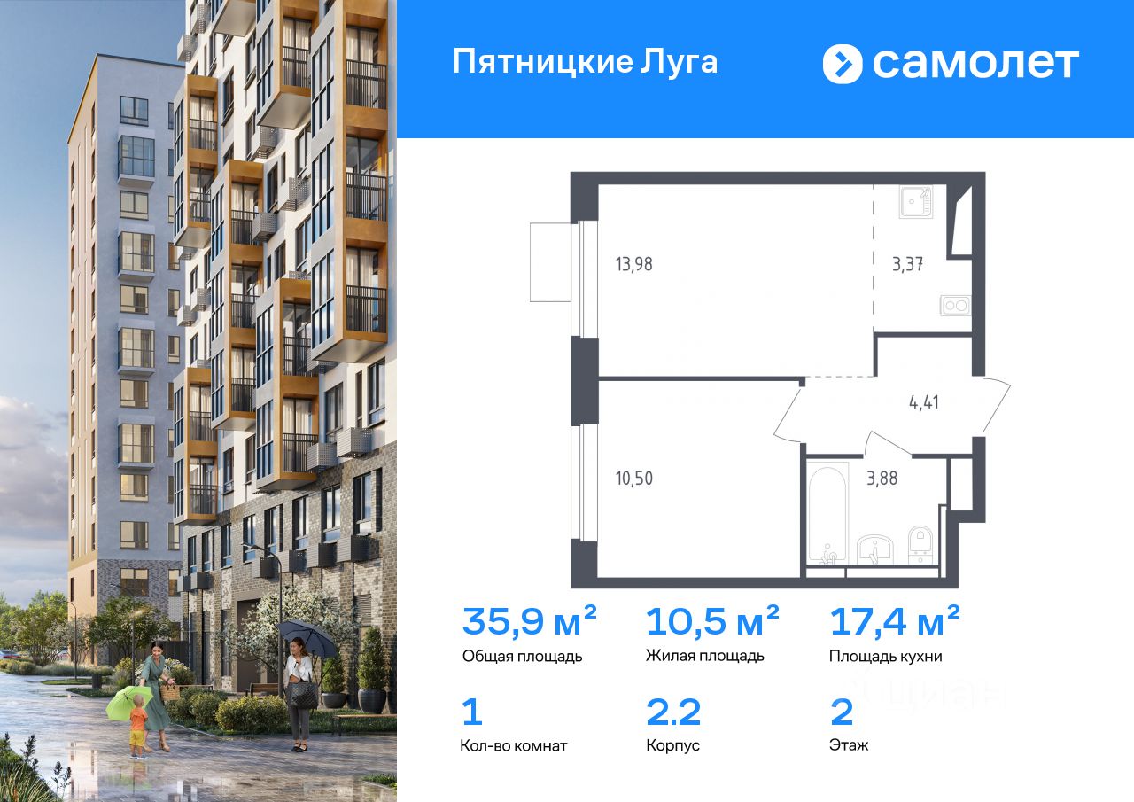 Строим кварталы для жизни с заботой о будущем. Предлагается 1-комнатная квартира комфорт-класса 35,9 кв.м в корпусе 2.2 на 2 этаже, в ЖК "Пятницкие Луга"