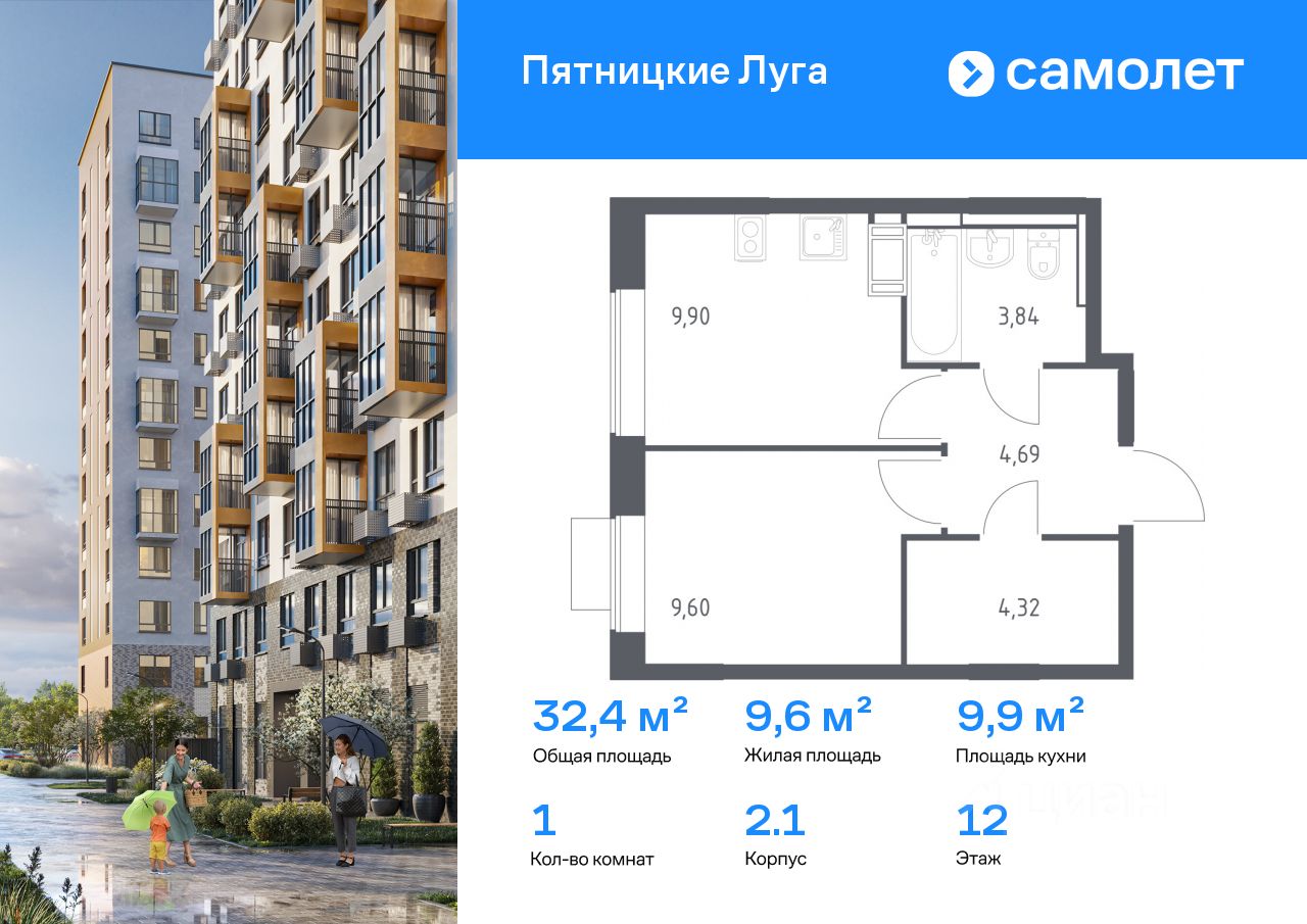 Строим кварталы для жизни с заботой о будущем. Предлагается 1-комнатная квартира комфорт-класса 32,35 кв.м в корпусе 2.1 на 12 этаже, в ЖК "Пятницкие Луга"