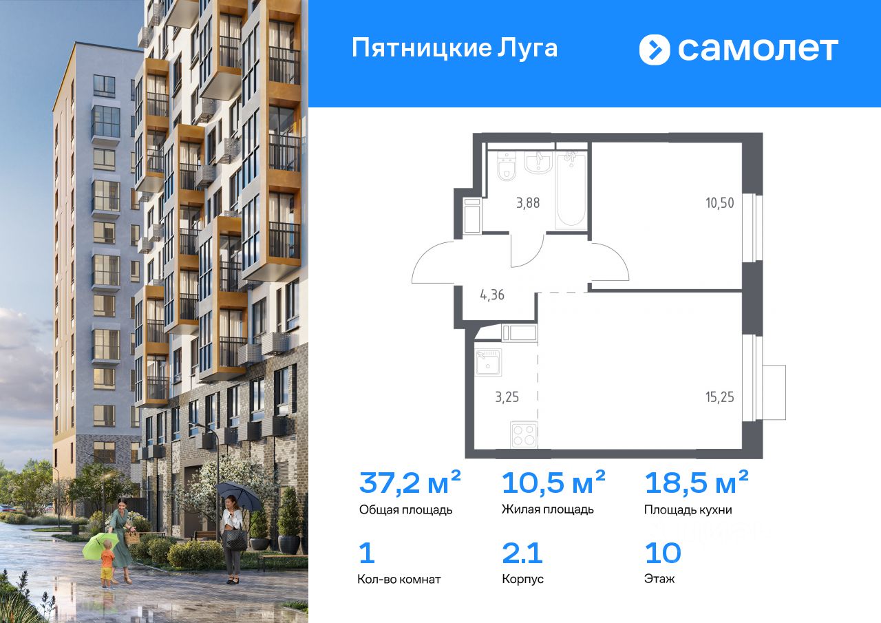 Строим кварталы для жизни с заботой о будущем. Предлагается 1-комнатная квартира комфорт-класса 37,24 кв.м в корпусе 2.1 на 10 этаже, в ЖК "Пятницкие Луга"
