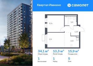 Строим кварталы для жизни с заботой о будущем. Предлагается 1-комнатная квартира комфорт-класса 34,1 кв.м в корпусе 1 на 5 этаже, в ЖК "Квартал Ивакино"