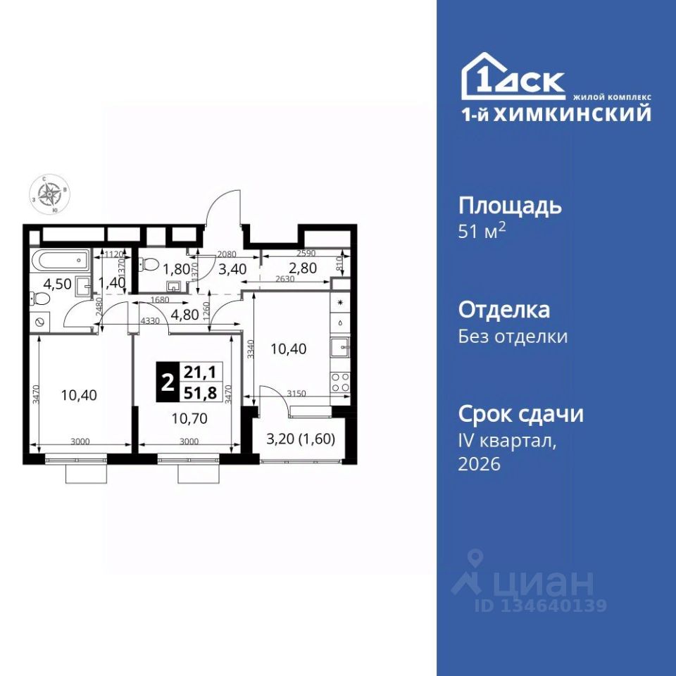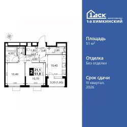 Продаётся 2-к квартира номер 65 общей площадью 51.8 кв.м. на 10-м этаже 17 этажного дома. Без отделки.