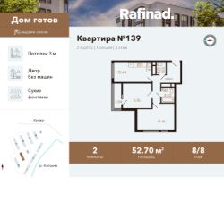Продаётся 2-комнатная квартира общей площадью 52.70 м² на 8 этаже.