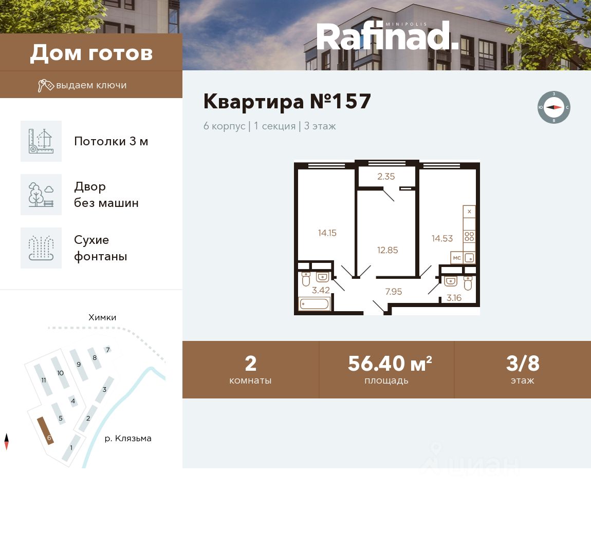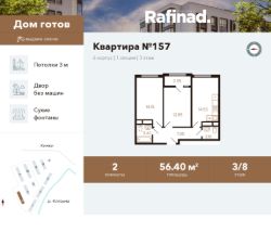 Продаётся 2-комнатная квартира общей площадью 56.40 м² на 3 этаже.