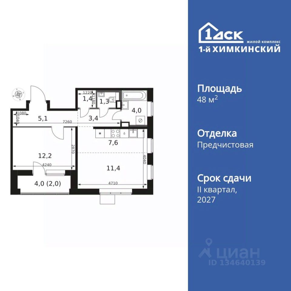 Продаётся 2-к квартира номер 74 общей площадью 48.4 кв.м. на 7-м этаже 17 этажного здания. Отделка Whitebox.