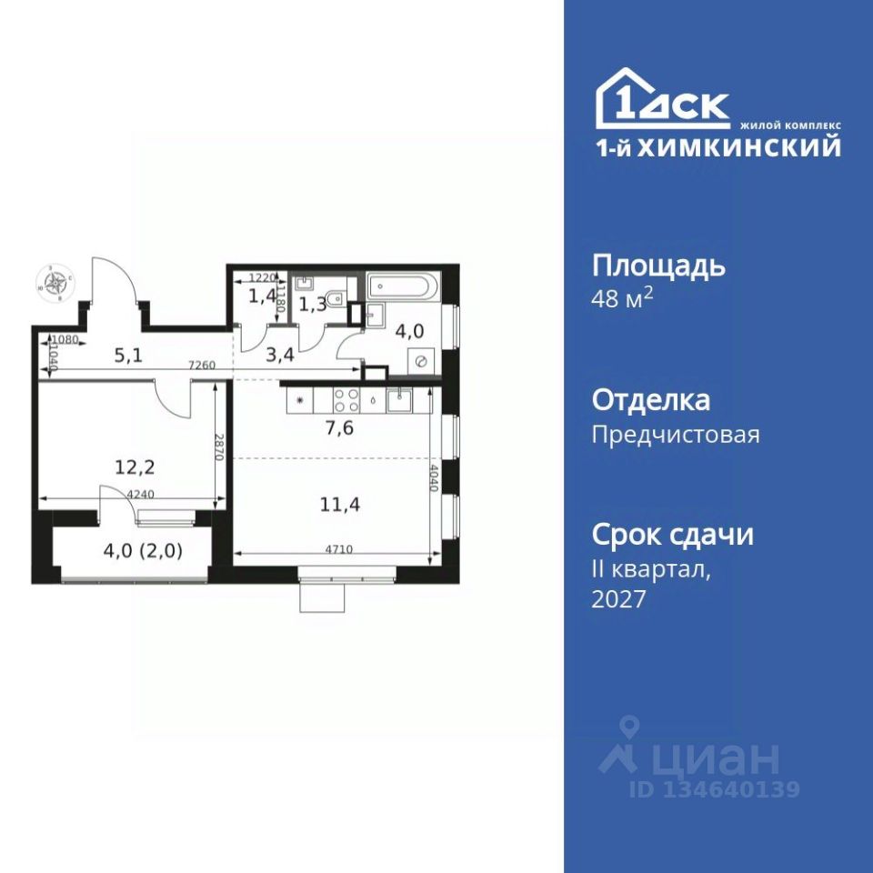 Продаётся 2-к квартира номер 144 общей площадью 48.4 кв.м. на 12-м этаже 17 этажного дома. Отделка Whitebox.