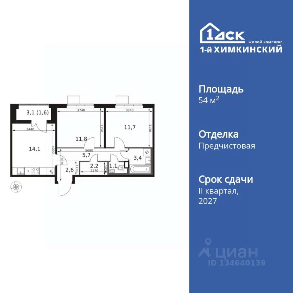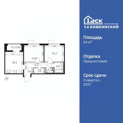 Продаётся 2-к квартира номер 390 общей площадью 54.2 кв.м. на 6-м этаже 12 этажного здания. Отделка Whitebox.