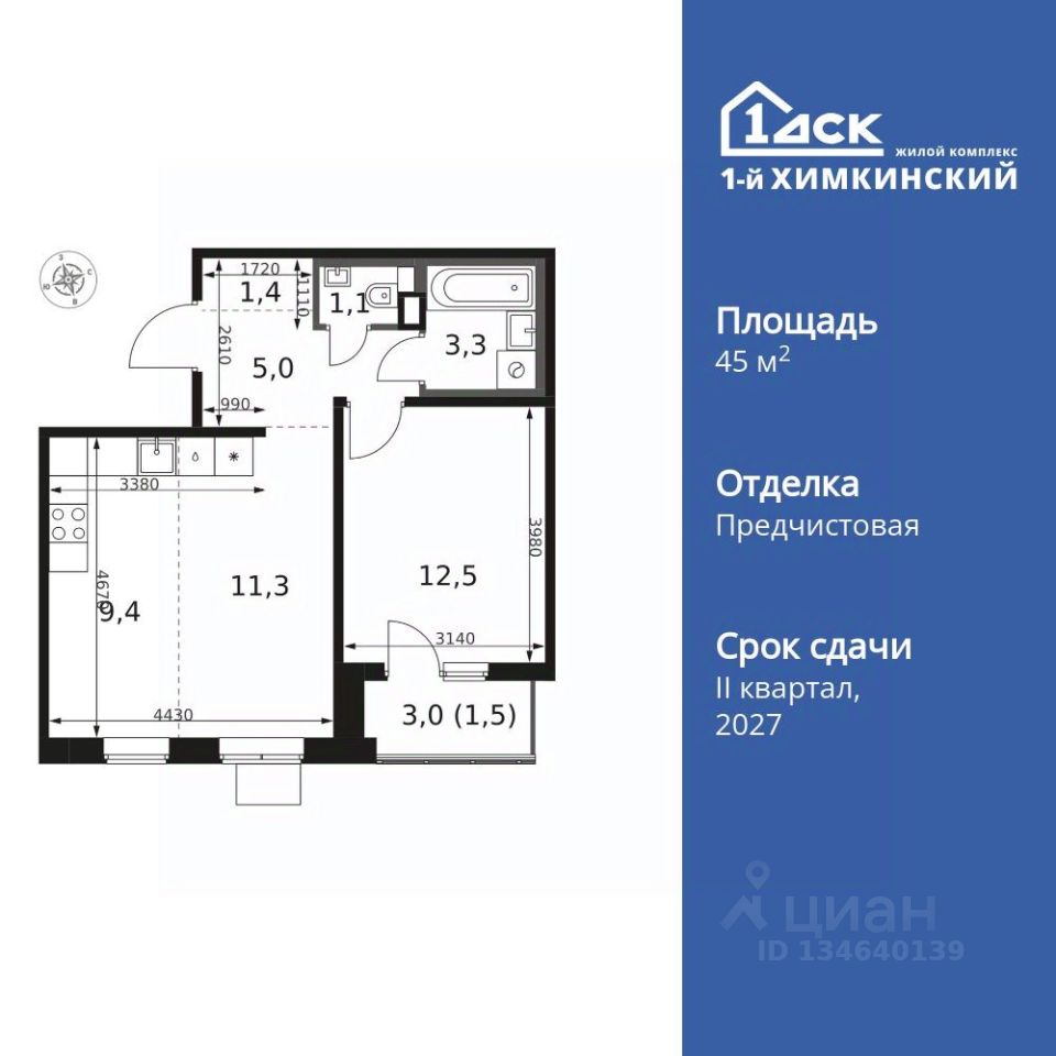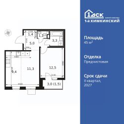 Продаётся 2-к квартира номер 405 общей площадью 45.5 кв.м. на 8-м этаже 12 этажного здания. Отделка Whitebox.