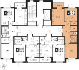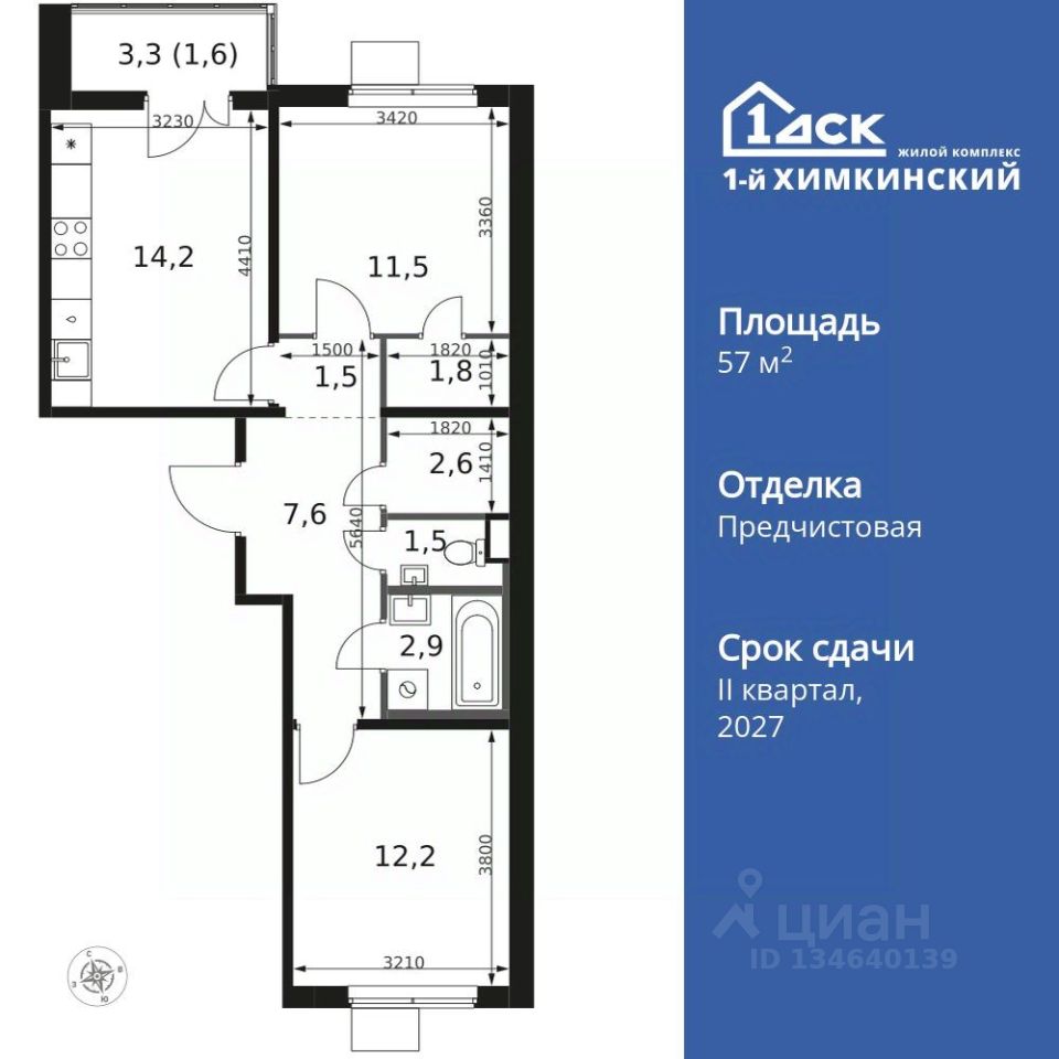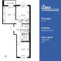 Продаётся 2-к квартира номер 678 общей площадью 57.4 кв.м. на 4-м этаже 8 этажного здания. Отделка Whitebox.