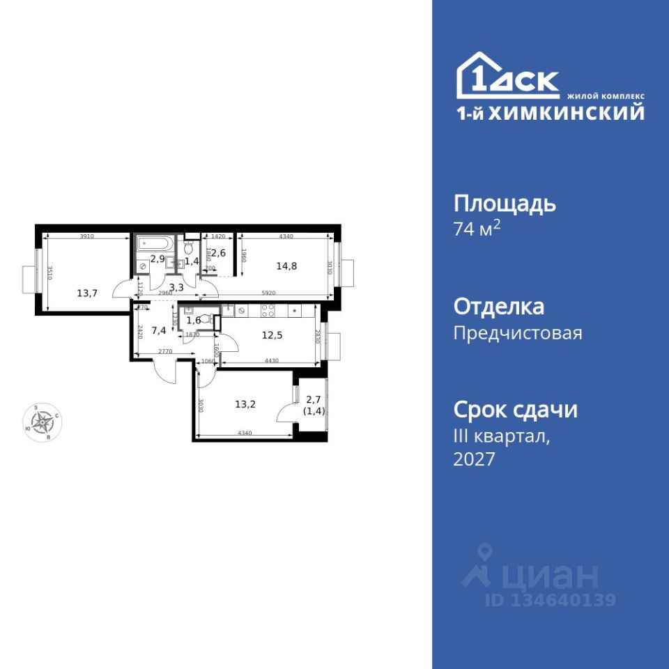 Продаётся 3-к квартира номер 284 общей площадью 74.8 кв.м. на 5-м этаже 6 этажного дома. Отделка Whitebox. Цена с учётом скидки!