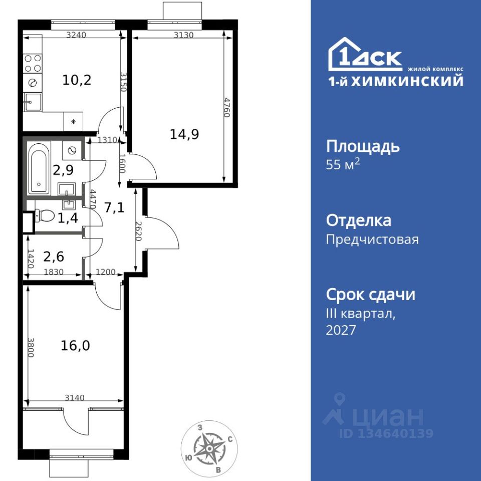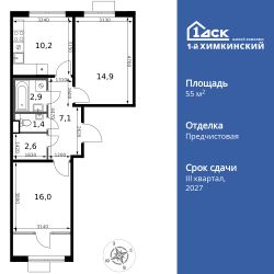 Продаётся 2-к квартира номер 299 общей площадью 55.1 кв.м. на 6-м этаже 6 этажного здания. Отделка Whitebox. Цена с учётом скидки.