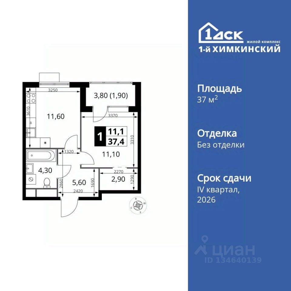 Продаётся 1-к квартира номер 267 общей площадью 37.4 кв.м. на 12-м этаже 16 этажного здания. Без отделки.
