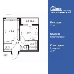 Продаётся 1-к квартира номер 100 общей площадью 37.7 кв.м. на 9-м этаже 17 этажного здания. Отделка Whitebox.