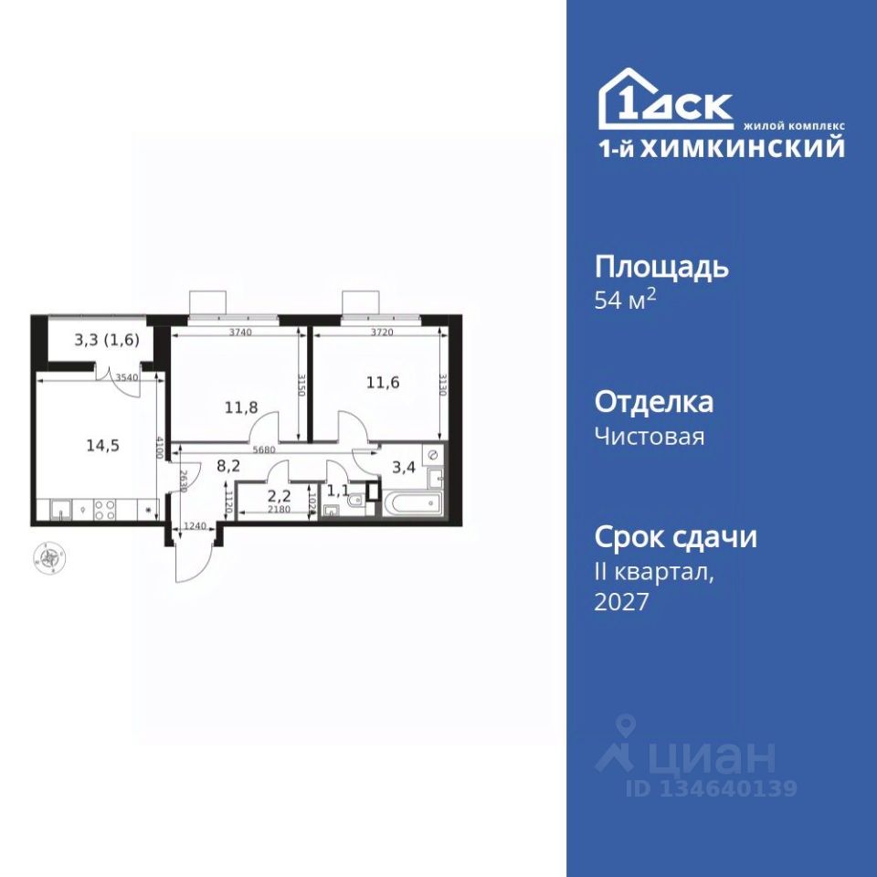 Продаётся 2-к квартира номер 261 общей площадью 54.4 кв.м. на 7-м этаже 14 этажного здания. Чистовая отделка.