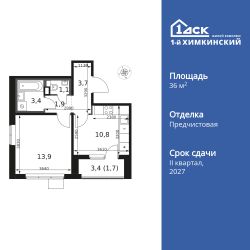 Продаётся 1-к квартира номер 344 общей площадью 36.5 кв.м. на 6-м этаже 8 этажного здания. Отделка Whitebox.