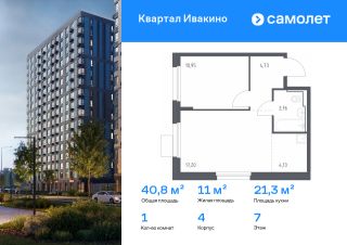 Строим кварталы для жизни с заботой о будущем. Предлагается 1-комнатная квартира комфорт-класса 40,77 кв.м в корпусе 4 на 7 этаже, в ЖК "Квартал Ивакино"