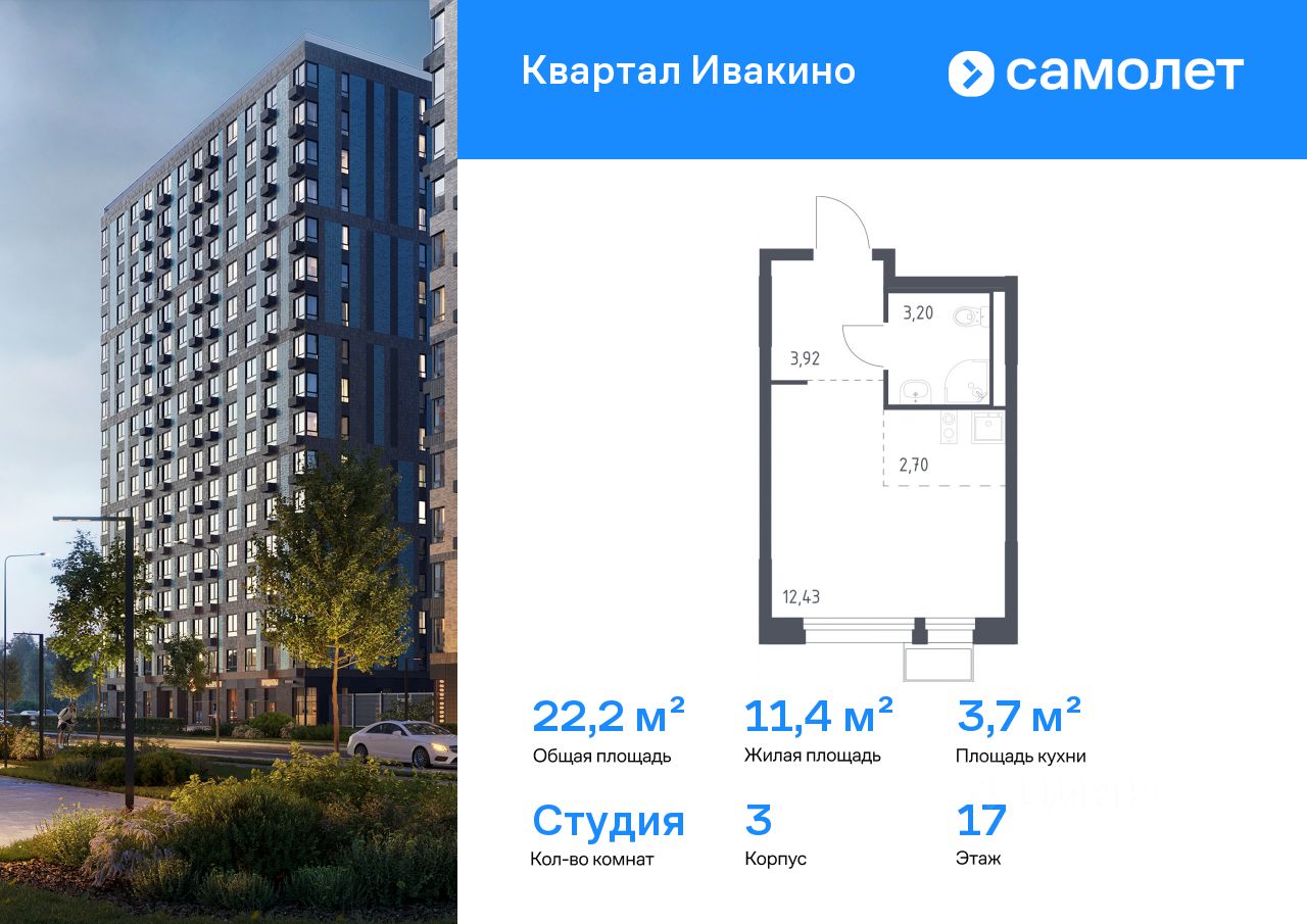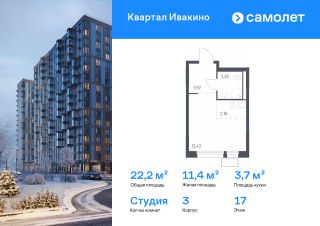 Строим кварталы для жизни с заботой о будущем. Предлагается квартира студия комфорт-класса 22,2 кв.м в корпусе 3 на 17 этаже, в ЖК "Квартал Ивакино"