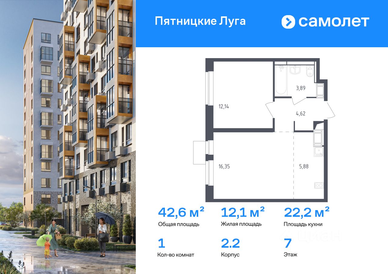 Строим кварталы для жизни с заботой о будущем. Предлагается 1-комнатная квартира комфорт-класса 42,6 кв.м в корпусе 2.2 на 7 этаже, в ЖК "Пятницкие Луга"