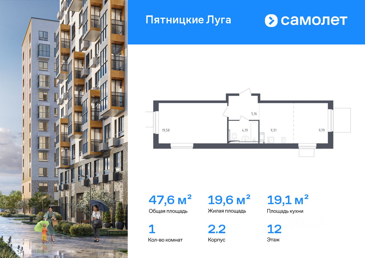 Строим кварталы для жизни с заботой о будущем. Предлагается 1-комнатная квартира комфорт-класса 47,6 кв.м в корпусе 2.2 на 12 этаже, в ЖК "Пятницкие Луга"