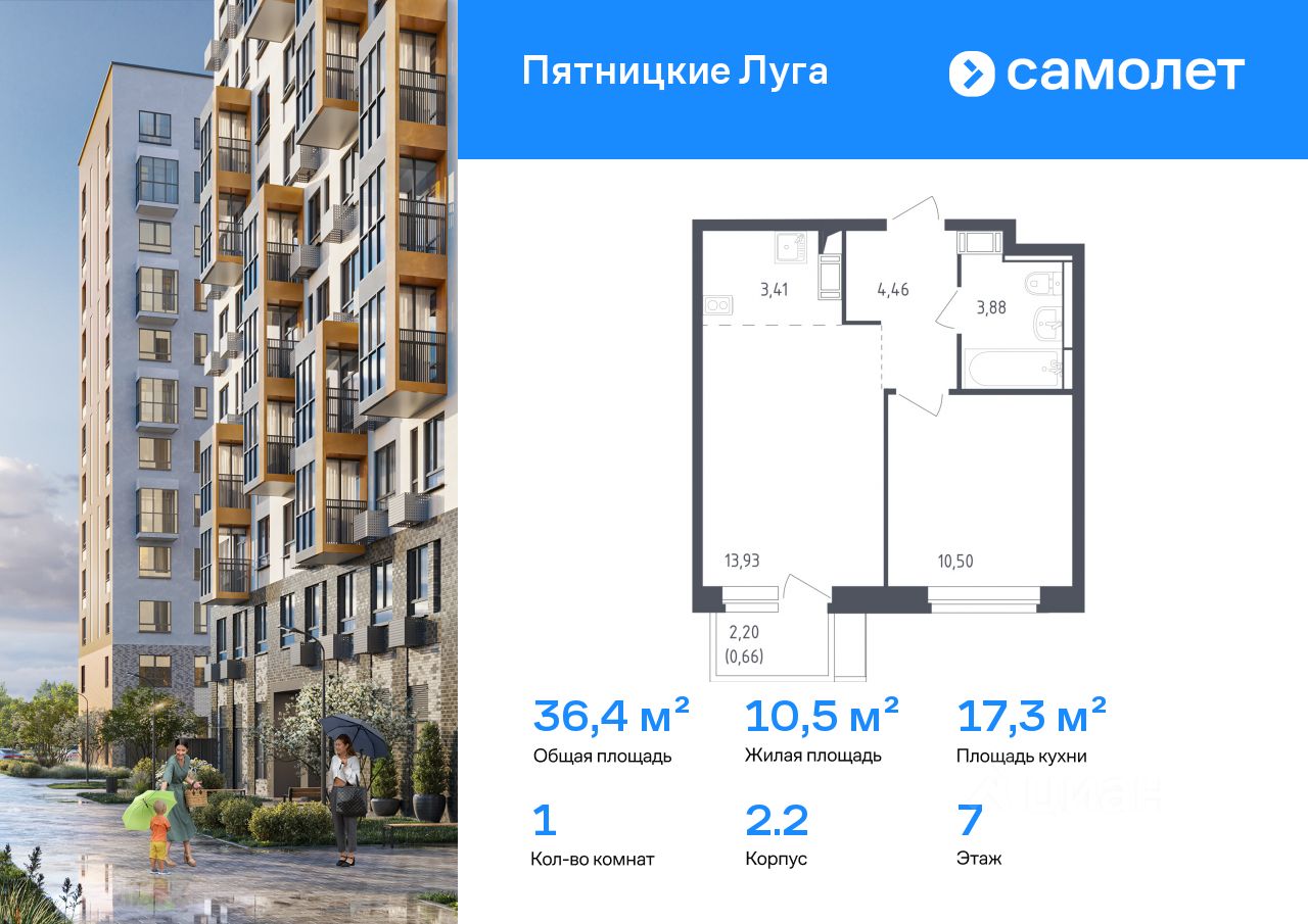 Строим кварталы для жизни с заботой о будущем. Предлагается 1-комнатная квартира комфорт-класса 36,4 кв.м в корпусе 2.2 на 7 этаже, в ЖК "Пятницкие Луга"