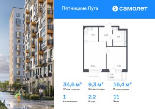 Строим кварталы для жизни с заботой о будущем. Предлагается 1-комнатная квартира комфорт-класса 34,6 кв.м в корпусе 2.2 на 11 этаже, в ЖК "Пятницкие Луга"