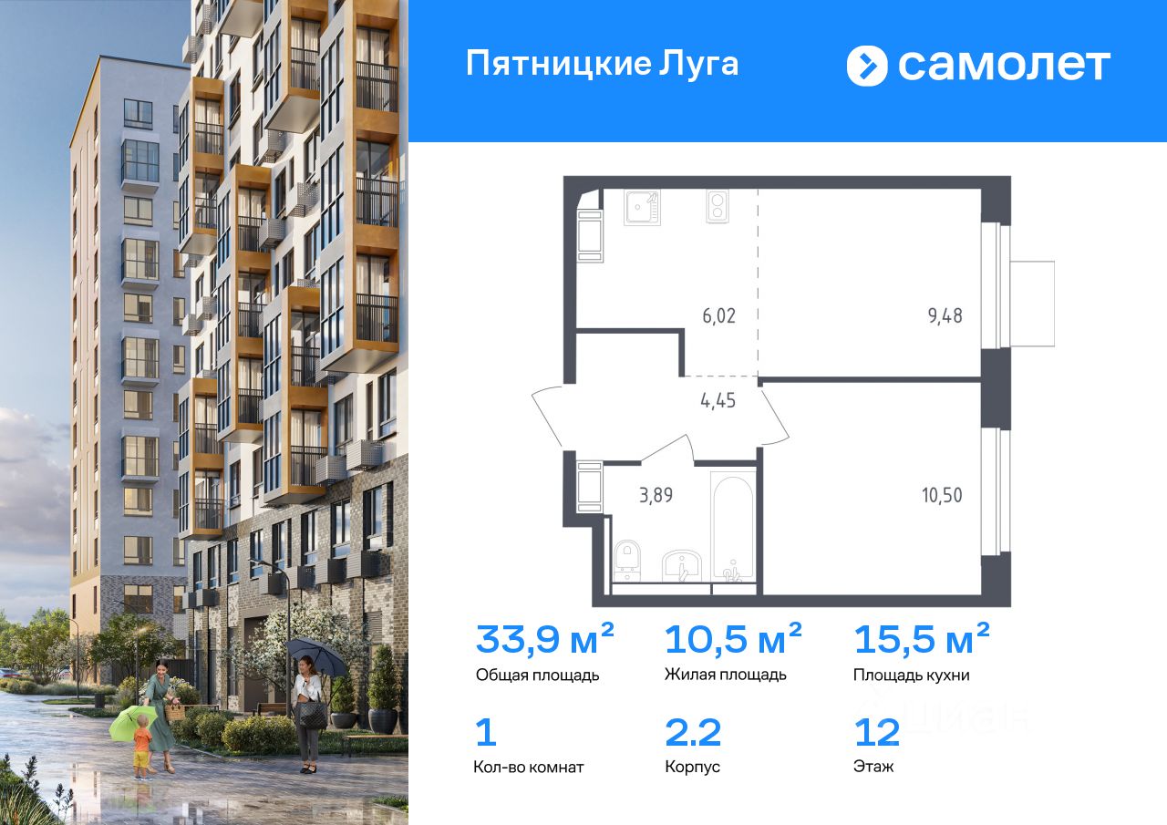 Строим кварталы для жизни с заботой о будущем. Предлагается 1-комнатная квартира комфорт-класса 33,9 кв.м в корпусе 2.2 на 12 этаже, в ЖК "Пятницкие Луга"