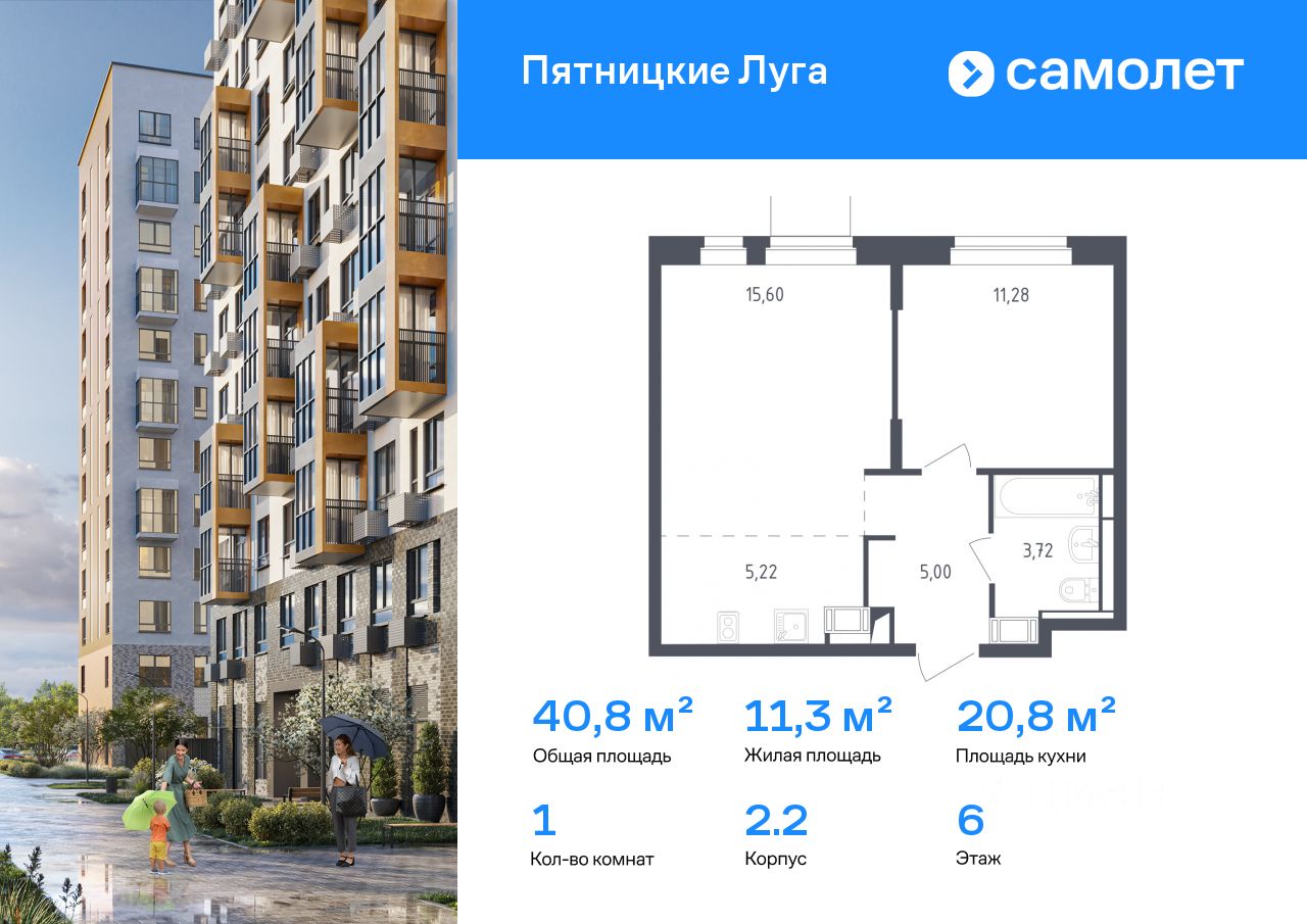 Строим кварталы для жизни с заботой о будущем. Предлагается 1-комнатная квартира комфорт-класса 40,8 кв.м в корпусе 2.2 на 6 этаже, в ЖК "Пятницкие Луга"