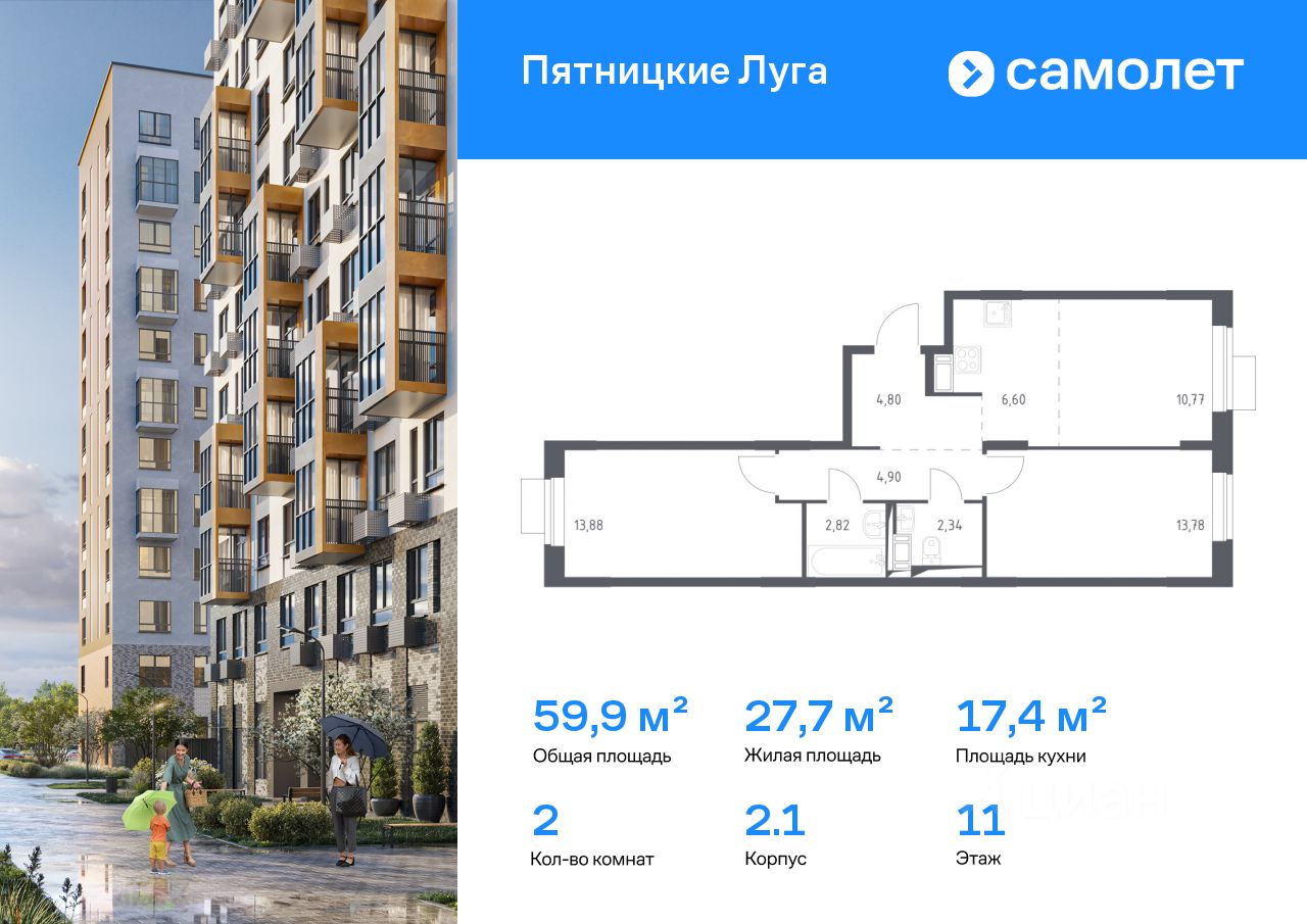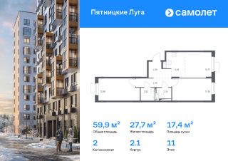 Строим кварталы для жизни с заботой о будущем. Предлагается 2-комнатная квартира комфорт-класса 59,89 кв.м в корпусе 2.1 на 11 этаже, в ЖК "Пятницкие Луга"