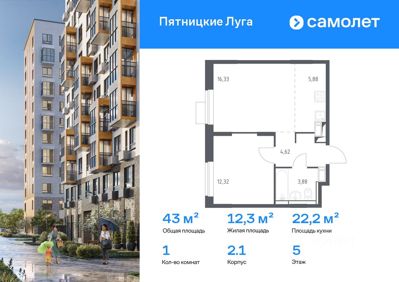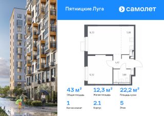 Строим кварталы для жизни с заботой о будущем. Предлагается 1-комнатная квартира комфорт-класса 43,03 кв.м в корпусе 2.1 на 5 этаже, в ЖК "Пятницкие Луга"