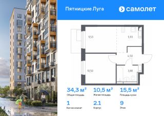 Строим кварталы для жизни с заботой о будущем. Предлагается 1-комнатная квартира комфорт-класса 34,34 кв.м в корпусе 2.1 на 9 этаже, в ЖК "Пятницкие Луга"
