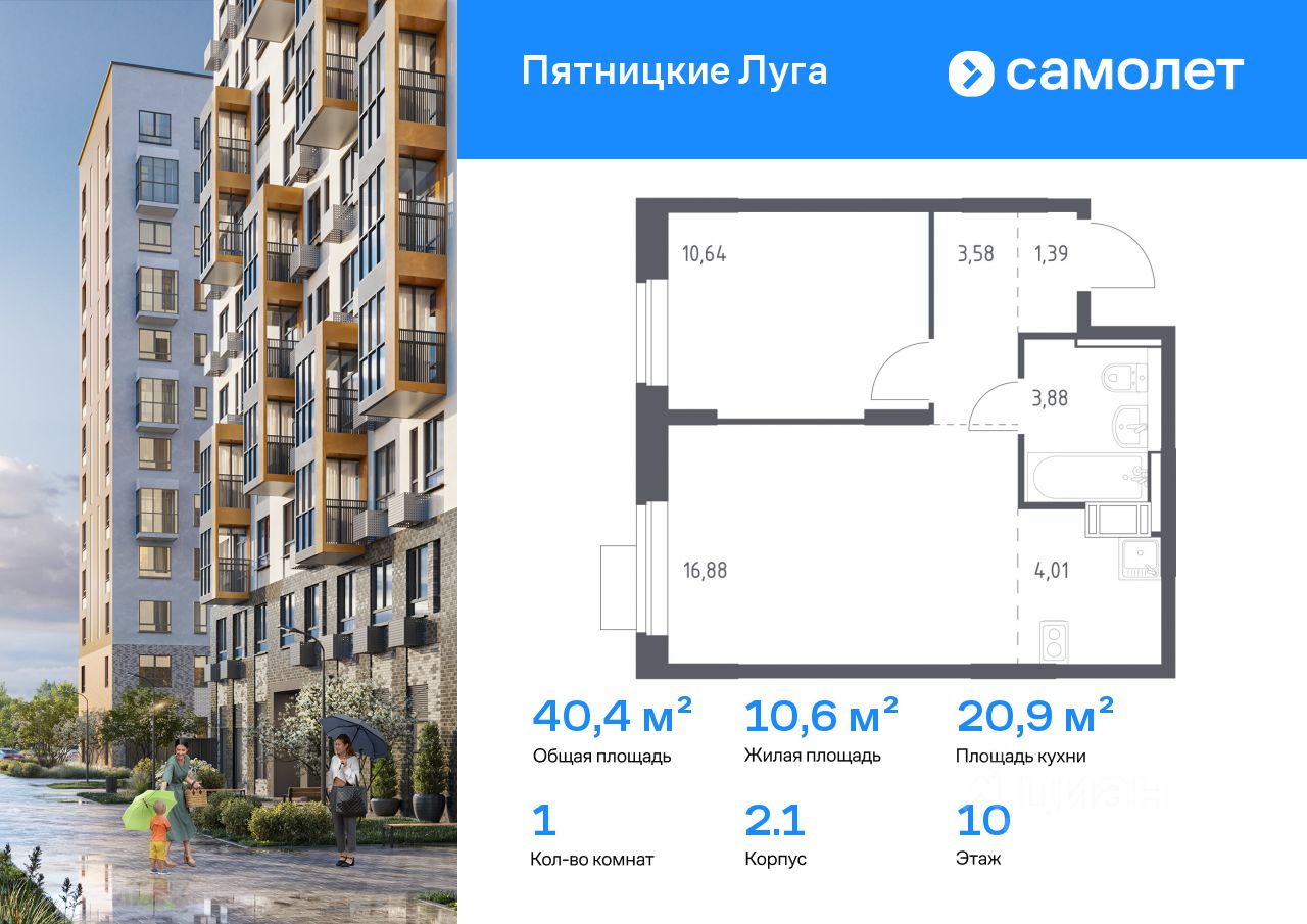 Строим кварталы для жизни с заботой о будущем. Предлагается 1-комнатная квартира комфорт-класса 40,38 кв.м в корпусе 2.1 на 10 этаже, в ЖК "Пятницкие Луга"