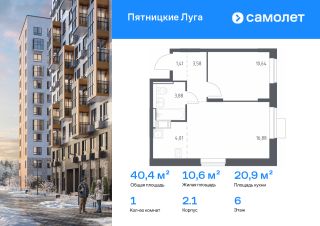 Строим кварталы для жизни с заботой о будущем. Предлагается 1-комнатная квартира комфорт-класса 40,4 кв.м в корпусе 2.1 на 6 этаже, в ЖК "Пятницкие Луга"