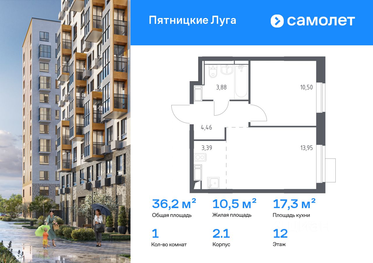 Строим кварталы для жизни с заботой о будущем. Предлагается 1-комнатная квартира комфорт-класса 36,18 кв.м в корпусе 2.1 на 12 этаже, в ЖК "Пятницкие Луга"