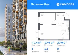 Строим кварталы для жизни с заботой о будущем. Предлагается 1-комнатная квартира комфорт-класса 40,38 кв.м в корпусе 2.1 на 9 этаже, в ЖК "Пятницкие Луга"