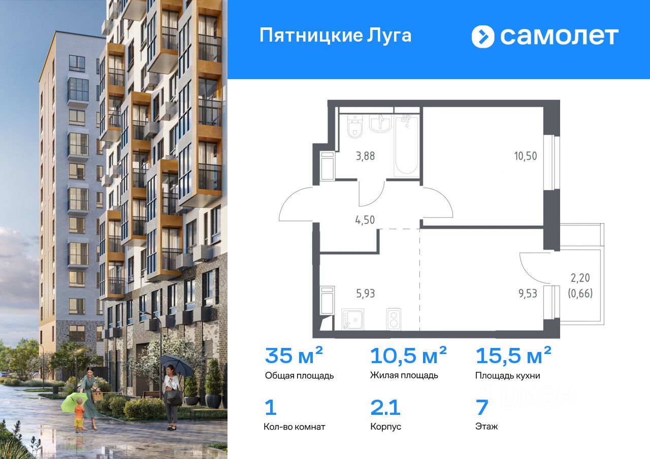 Строим кварталы для жизни с заботой о будущем. Предлагается 1-комнатная квартира комфорт-класса 35 кв.м в корпусе 2.1 на 7 этаже, в ЖК "Пятницкие Луга"