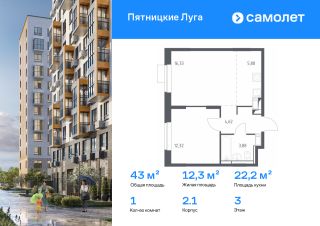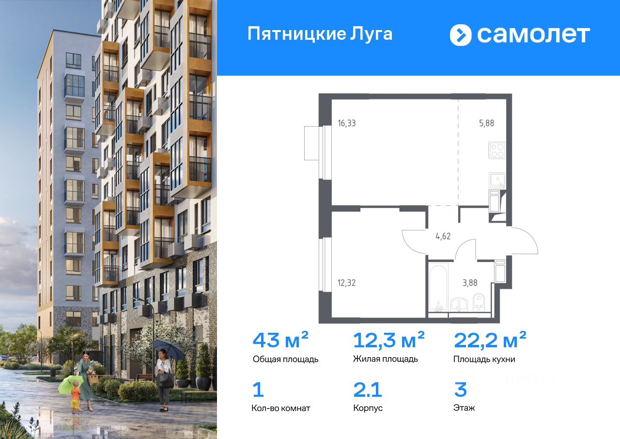 Строим кварталы для жизни с заботой о будущем. Предлагается 1-комнатная квартира комфорт-класса 43,03 кв.м в корпусе 2.1 на 3 этаже, в ЖК "Пятницкие Луга"