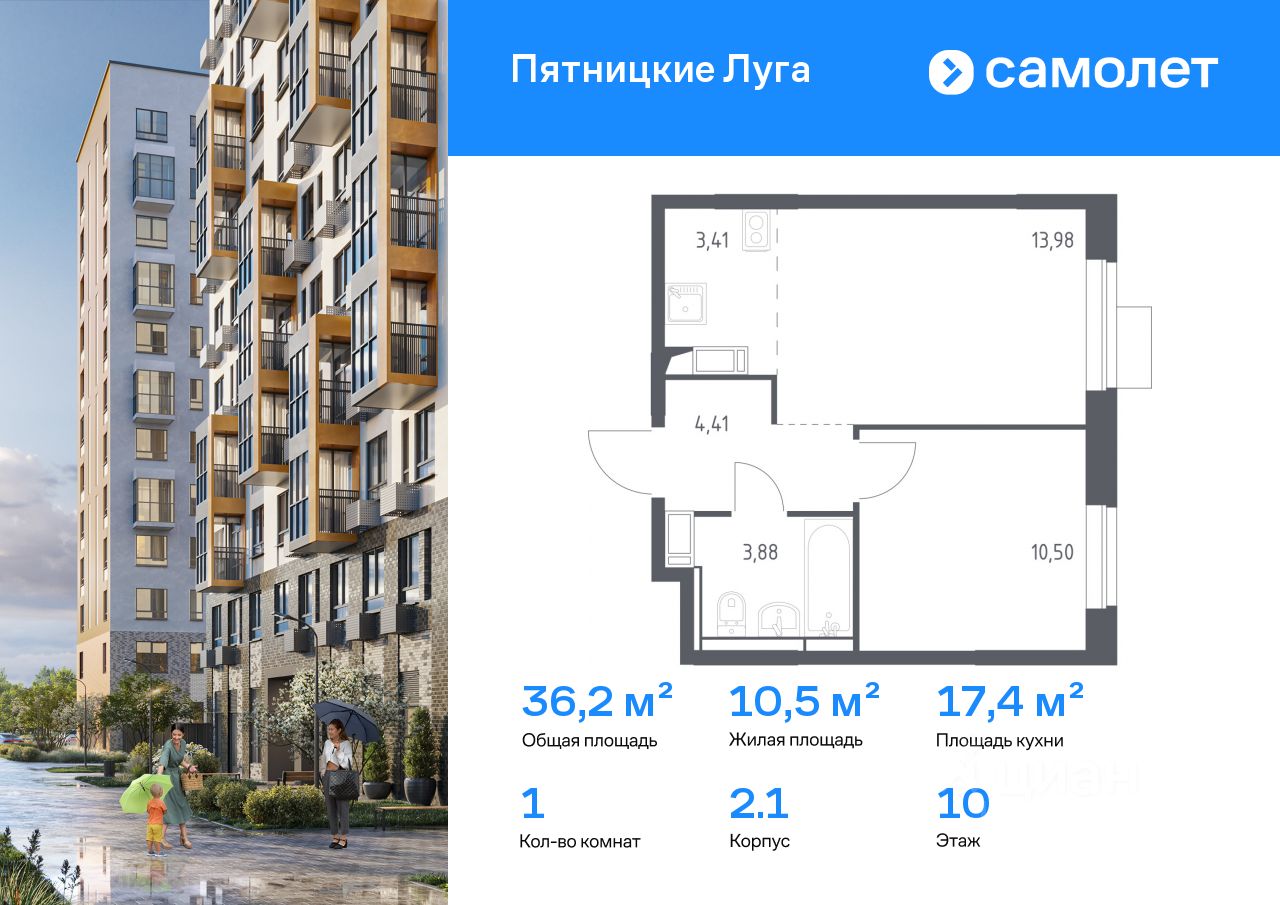 Строим кварталы для жизни с заботой о будущем. Предлагается 1-комнатная квартира комфорт-класса 36,18 кв.м в корпусе 2.1 на 10 этаже, в ЖК "Пятницкие Луга"