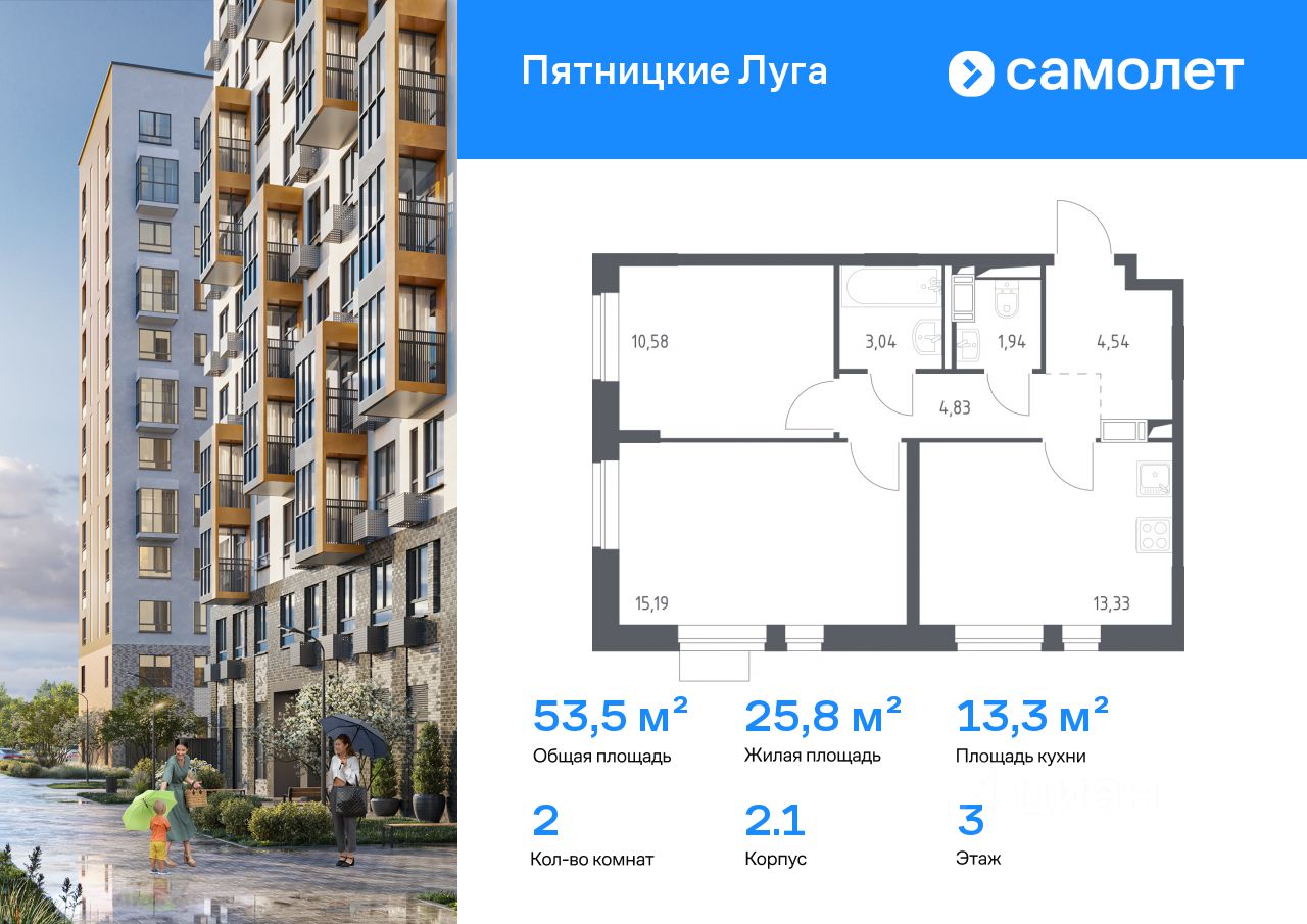 Строим кварталы для жизни с заботой о будущем. Предлагается 2-комнатная квартира комфорт-класса 53,45 кв.м в корпусе 2.1 на 3 этаже, в ЖК "Пятницкие Луга"