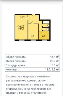 Продается уютная двухкомнатная квартира в панельном доме 1979 года постройки. Общая площадь — 44.1 кв. м, жилая — 27.9 кв. м, кухня — 6 кв. м. Квартира расположена на 4 этаже 9-этажного дома. Высота потолков — 2.64 метра. Окна выходят во двор, что обеспечивает тишину и уединенность. До метро "Беломорская" всего 8 минут на автомобиле.