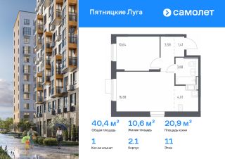 Строим кварталы для жизни с заботой о будущем. Предлагается 1-комнатная квартира комфорт-класса 40,4 кв.м в корпусе 2.1 на 11 этаже, в ЖК "Пятницкие Луга"