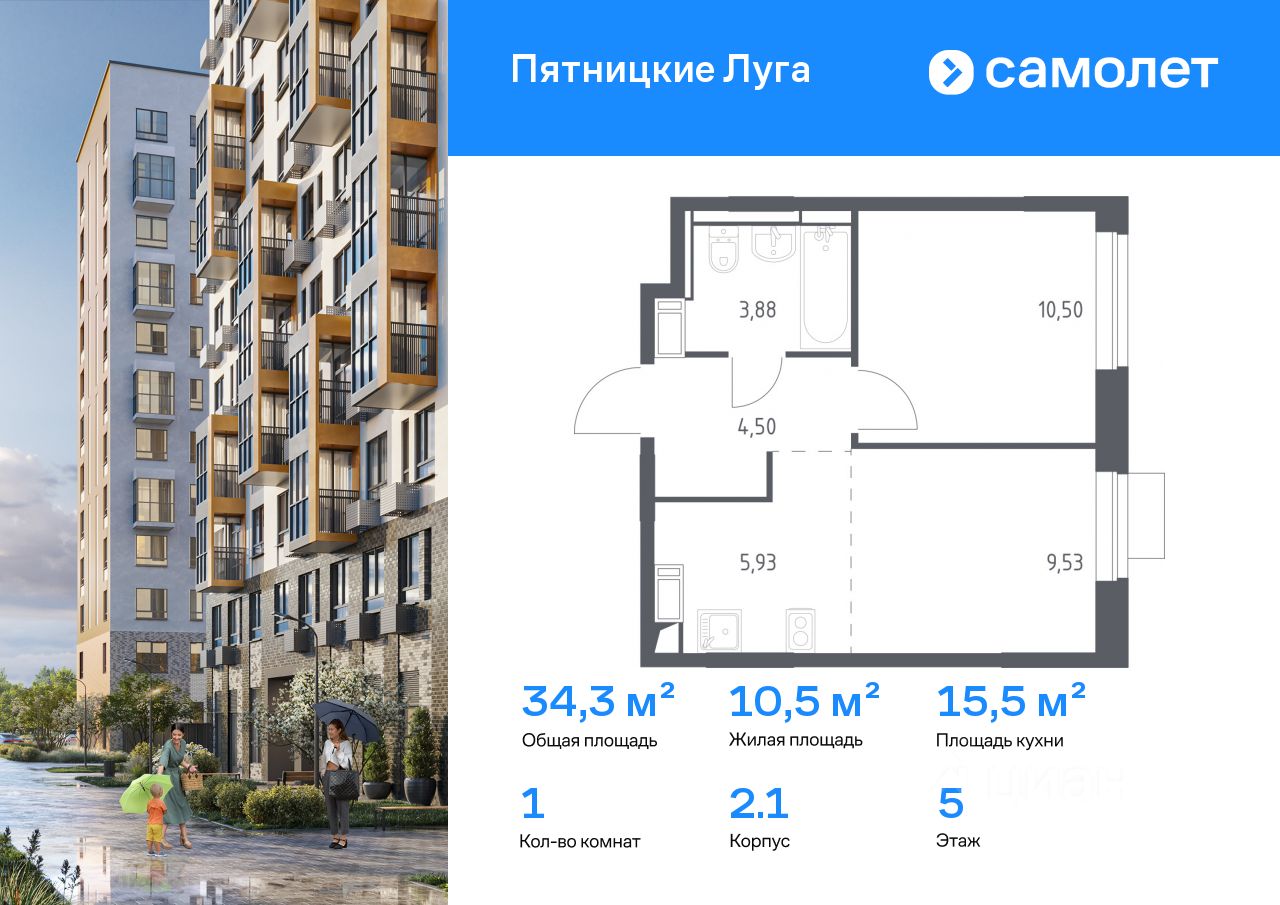 Строим кварталы для жизни с заботой о будущем. Предлагается 1-комнатная квартира комфорт-класса 34,34 кв.м в корпусе 2.1 на 5 этаже, в ЖК "Пятницкие Луга"