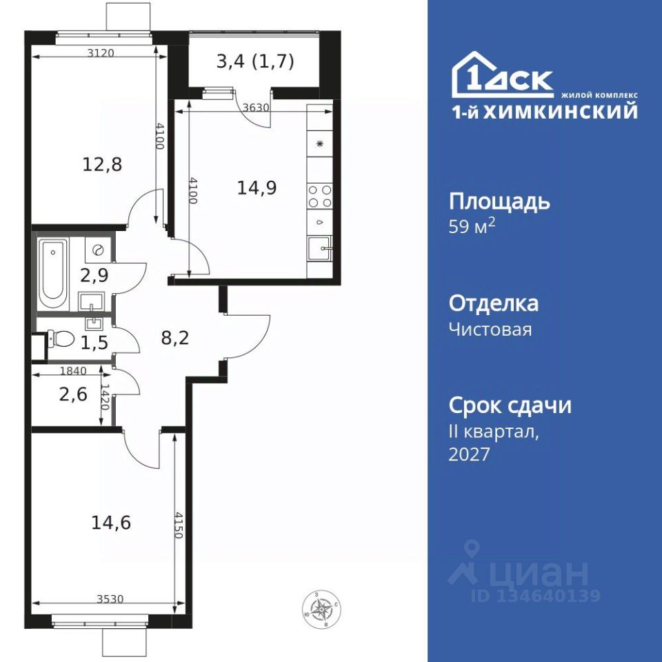 Продаётся 2-к квартира номер 259 общей площадью 59.2 кв.м. на 6-м этаже 14 этажного здания. Чистовая отделка.