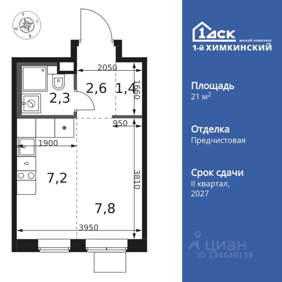 Продаётся квартира-студия номер 572 общей площадью 21.3 кв.м. на 7-м этаже 17 этажного здания. Отделка Whitebox.