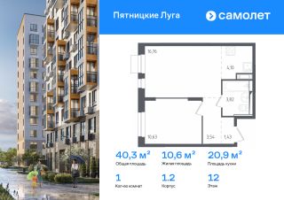 Строим кварталы для жизни с заботой о будущем. Предлагается 1-комнатная квартира комфорт-класса 40,3 кв.м в корпусе 1.2 на 12 этаже, в ЖК "Пятницкие Луга"