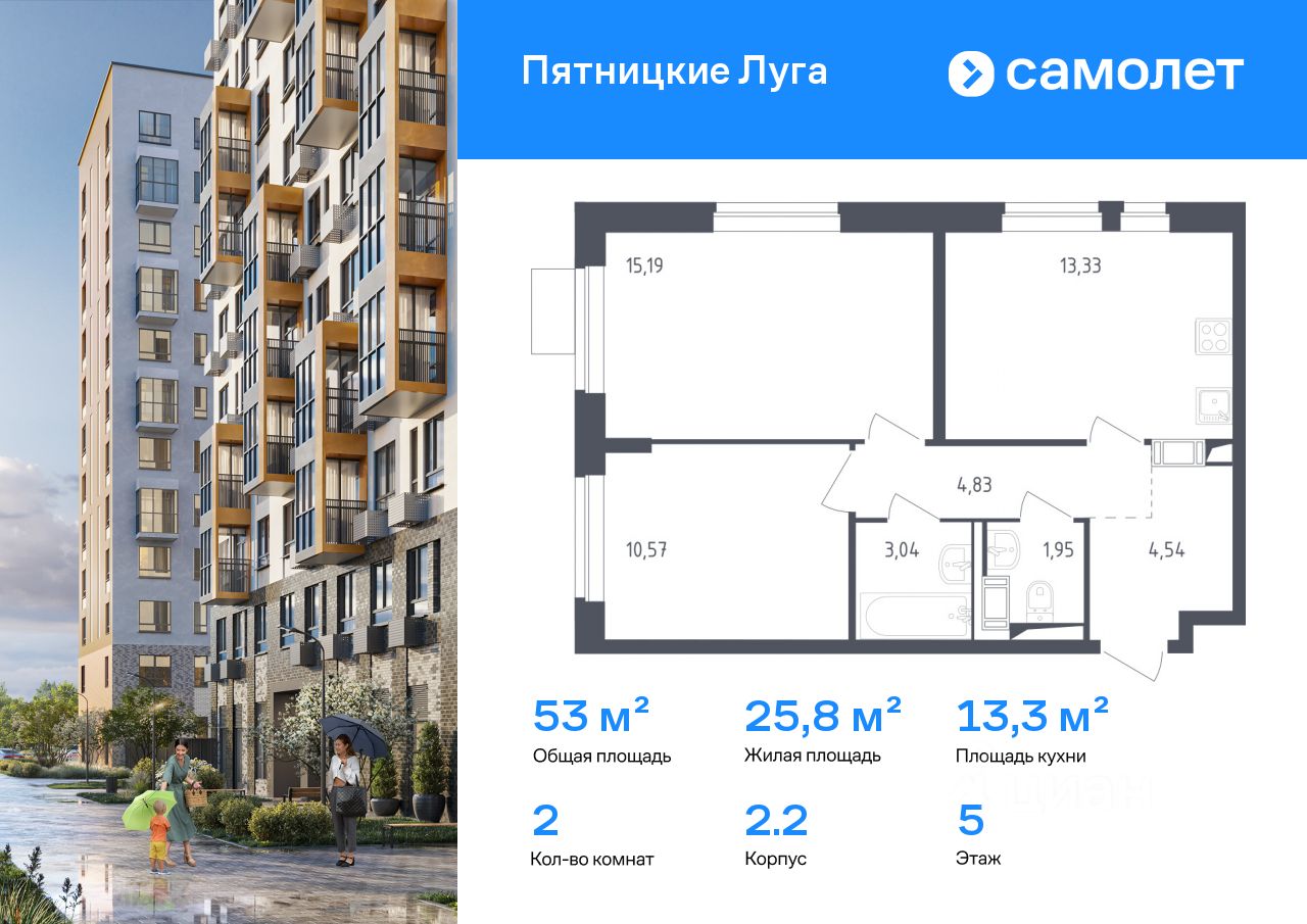 Строим кварталы для жизни с заботой о будущем. Предлагается 2-комнатная квартира комфорт-класса 53 кв.м в корпусе 2.2 на 5 этаже, в ЖК "Пятницкие Луга"
