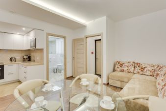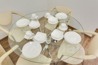 В гостиной - большой раскладывающийся угловой диван со спальным местом 140x200, LED телевизор с выходом в интернет, стеклянный стол, 5 стульев, "умная" приточно-отточная бесшумная система вентиляции и кондиционирования Mitsubishi Lossnay.