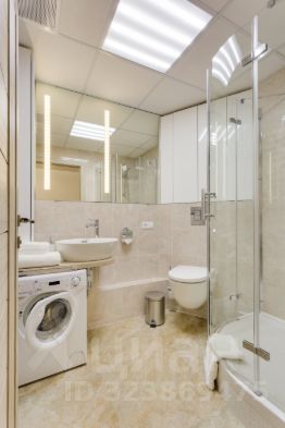 В санузле - гигиеничный полностью стеклянный душевой уголок с керамическим поддоном с термостатическим смесителем душа, раковина-чаша с дизайн-смесителем, гигиеничный подвесной безободковый унитаз, теплый пол и полотенцесушитель, фен, стиральная машина.